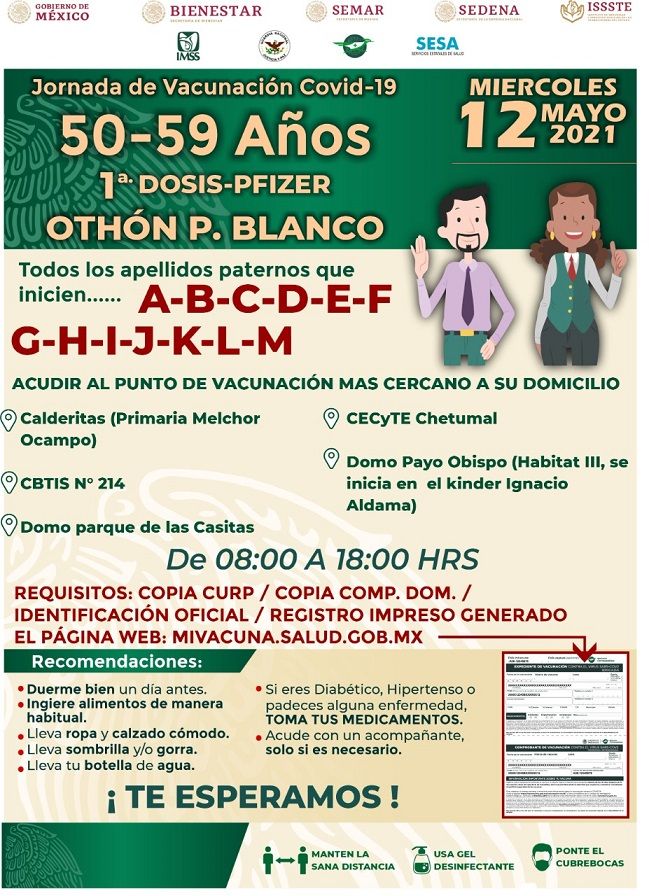 Chetumal.- Si tienes entre 50 y 59 años de edad, este miércoles 12 de mayo inicia en esta ciudad y en la comunidad de Calderitas la vacunación contra el Covid 19. Checa los detalles: