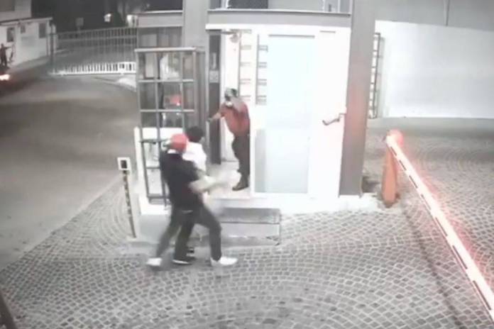 El hombre intenta cerrar la puerta de la caseta de vigilancia para resguardarse de los agresores pero estos continúan golpeándolo.