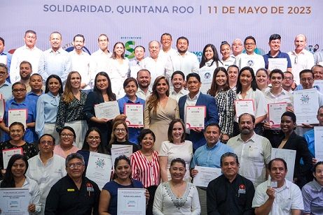 Certificados y Distintivos para 77 empresas de Othón P. Blanco, Puerto Morelos, Lázaro Cárdenas, Isla Mujeres, Cozumel, Tulum, Benito Juárez y Solidaridad, en un evento que encabezó la gobernadora Mara Lezama Espinosa.