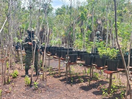 Chetumal, Q. Roo.- La Secretaría de la Defensa Nacional a través de la Comandancia de la 34/a. Zona Militar, hacen del conocimiento que en marco de la Estrategia Nacional de Seguridad Pública y de la política de cero Impunidad del gobierno federal, personal del Séptimo Regimiento de Caballería Motorizado, al realizar reconocimientos a pie y en vehículo localizó en inmediaciones del poblado de Limones, Mpio. Bacalar, Q. Roo, un área habilitada como invernadero conteniendo plantas de marihuana en macetas, en un espacio de 100 x 60 metros.