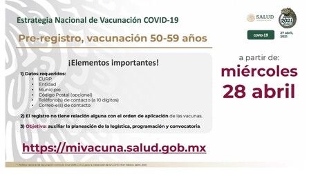 Esta iniciará con el pre-rregistro de las personas, las cuales podrán ingresar al portal mivacuna.salud.gob.mx para llevarlo a cabo a partir del miércoles 28 de abril, detalló Ruy López Ridaura, director general del Centro Nacional de Programas Preventivos y Control de Enfermedades.