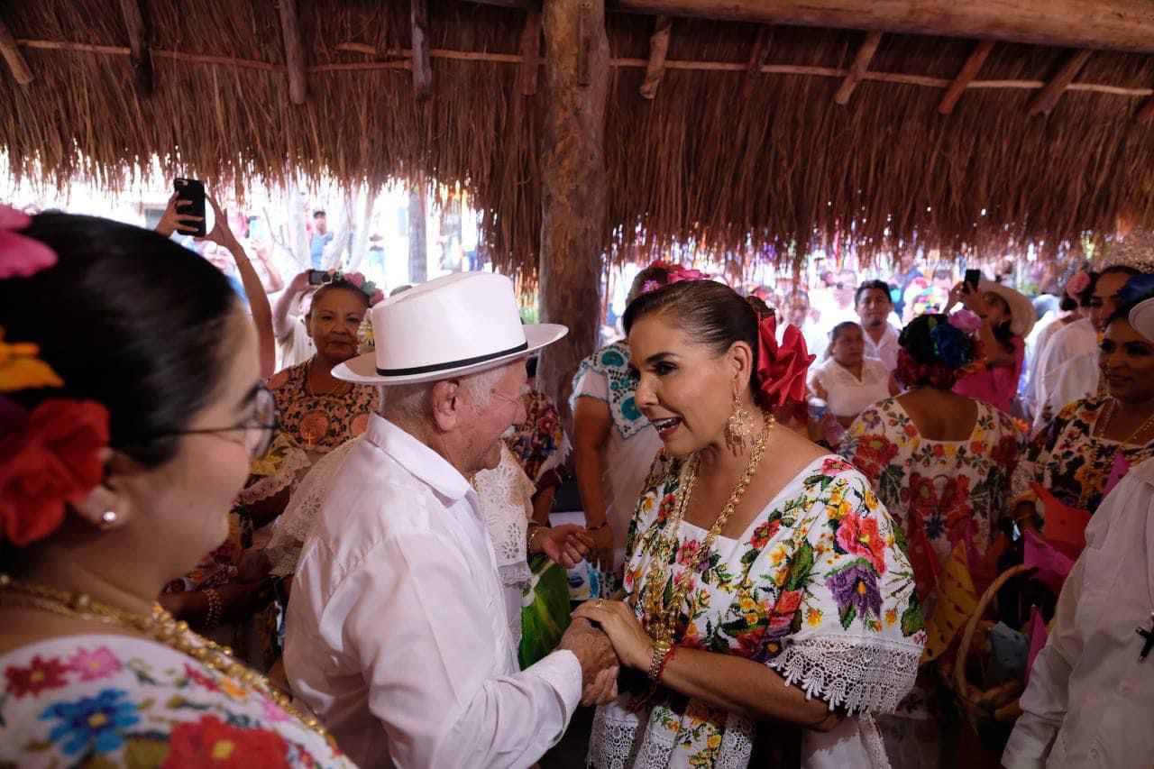 El Cedral.- Vestida con el terno regional y respetando tradiciones y costumbres la gobernadora Mara Lezama Espinosa participó en el baile de la cabeza de cochino y clausura de las fiestas en honor de la Santa Cruz de Sabán que tiene 175 años de compartir con las familias cozumeleñas que representa nuestra cultura viva e identidad.