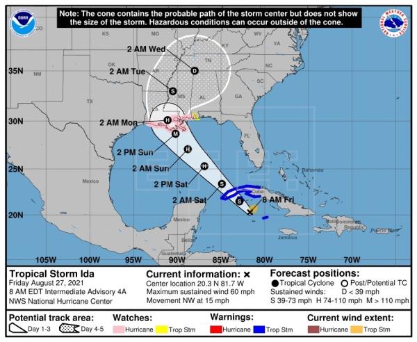 La tormenta tropical Ida podría llegar a la costa estadounidense del Golfo de México cerca de Nueva Orleans este fin de semana como un poderoso huracán, ya que se fortaleció durante la noche, informó el Centro Nacional de Huracanes (CNH), emitiendo avisos de huracán y tormenta tropical para gran parte de la zona.