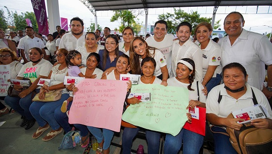 El total de las beneficiarias de las tarjetas de apoyo del programa Mujer es Poder es de 39 mil 600 mujeres. La primera entrega fue en Benito Juárez en beneficio de 12 mil 284 mujeres. Flanqueada por las señoras Martina Beatriz Yam Avilés y Nancy Guzmán Reyes, las dos primeras mujeres en recibir su tarjeta en Chetumal, la gobernadora Mara Lezama convocó a todas las presentes a sumarse al Nuevo Acuerdo por el Bienestar y Desarrollo de Quintana Roo, para hacer de su parte y combatir frontalmente la violencia.