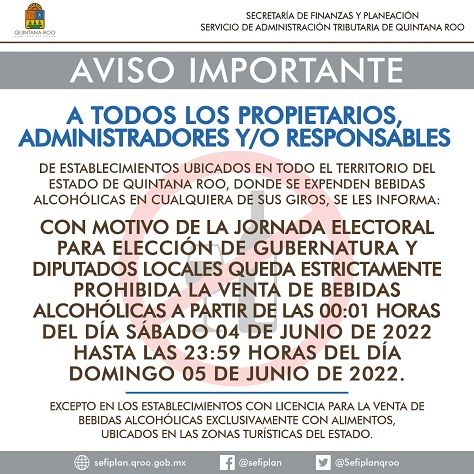 La prohibición de la expedición de bebidas alcohólicas correrá a partir de las 00:01 horas del día sábado 4 de junio y hasta las 23:59 horas del día domingo 5 de junio 2022; quedando exentos los establecimientos con el giro de Restaurante y Restaurante-Bar con venta exclusivamente con alimentos ubicados en las zonas turísticas.