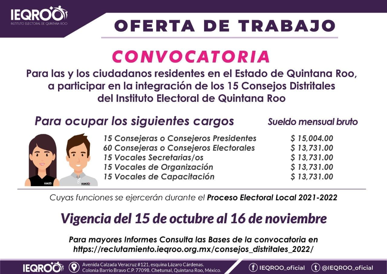 Chetumal. – El Instituto Electoral de Quintana Roo (IEQROO), reitera la invitación a las ciudadanas y ciudadanos residentes en el Estado para ocupar las 120 ofertas de trabajo para la integración de los 15 Consejos Distritales, cuyas funciones ejercerán en el Proceso Electoral Local 2021-2022. La fecha límite para inscribirse termina el 16 de noviembre del año en curso. Para mayores informes consulta las bases de la convocatoria en: https://reclutamiento.ieqroo.org.mx/consejos_distritales_2022/ y súmate a ser parte de este equipo ciudadano.