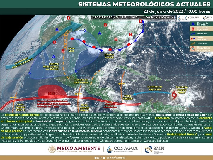 La onda tropical 6 ha generado en las últimas horas cielo nublado con chubascos en la Península de Yucatán, por lo que se prevé que continúen las lluvias este viernes. Aunque la onda de calor se ha debilitado con el paso de ondas tropicales en México, se prevé que las temperaturas puedan llegar hasta los 40 grados en Quintana Roo, que llegó a sensación térmica de 44.9 grados en las últimas 24 horas.
