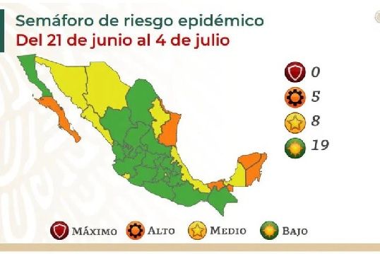 La Secretaría de Salud compartió la tarde de este viernes el Semáforo de Riesgo Epidemiológico por COVID-19 que estará vigente para las próximas dos semanas, de los días 21 de junio al 4 de julio. La dependencia de gobierno apuntó que serán 19 entidades federativas las que estarán en color verde, mientras que ocho estados adoptarán las medidas establecidas con amarillo, cinco en naranja y ninguno en rojo, de acuerdo con el Informe diario sobre COVID-19. La Ciudad de México volverá a color amarillo.