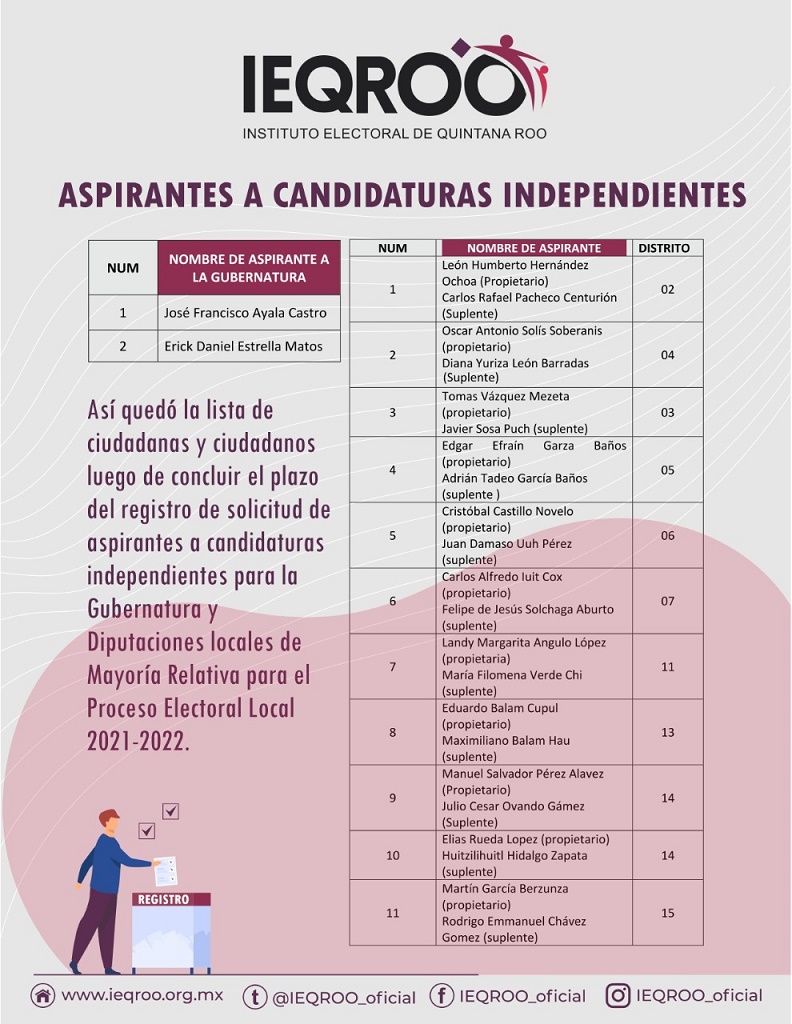 Chetumal. – El Instituto Electoral de Quintana Roo (IEQROO), informó que dos ciudadanos solicitaron su registro como aspirantes a la candidatura a Gobernador, mientras que once se registraron para Diputaciones locales de Mayoría Relativa para contender en el Proceso Electoral Local 2021-2022; luego de que ayer a las 12:00 horas concluyera el registro de solicitud de aspirantes a candidaturas independientes.