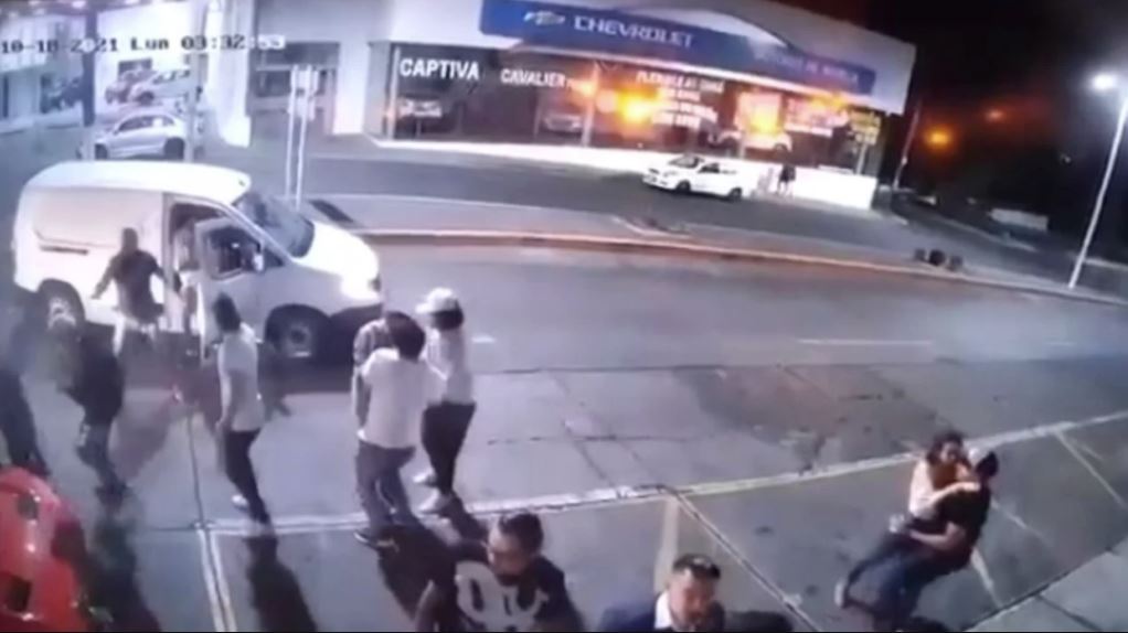 En la grabación se muestra cómo al menos una veintena de personas se encuentran parados afuera del establecimiento La Cantina 25, para que después bajen dos sujetos de una camioneta tipo Van.