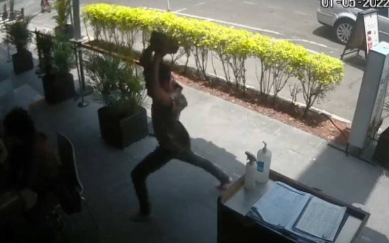 Cámaras de seguridad captaron el momento en que el sujeto se acerca a una de las mesas y, sin razón alguna, arrojó un tabique contra la cabeza del infante que estaba sentado de espalda hacia la calle.