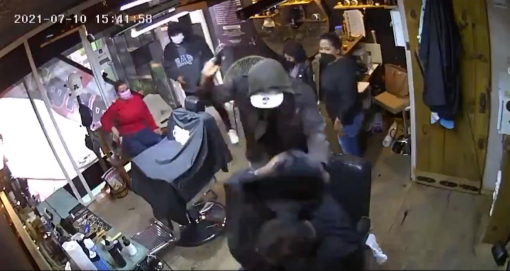 Uno de los asaltantes entra y sale del local y busca las llaves durante varios segundos. Mientras tanto, el otro sujeto toma las bolsas de mano de las dos mujeres. Luego salen del local y encierran en su interior a las cuatro personas, bajando la cortina negra de la barbería.