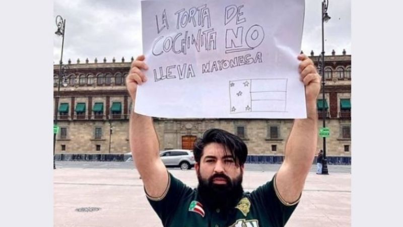 México.- Se volvieron virales las imágenes de una pequeña protesta frente a Palacio Nacional, donde un joven denuncia que las tortas de cochinita no llevan mayonesa.